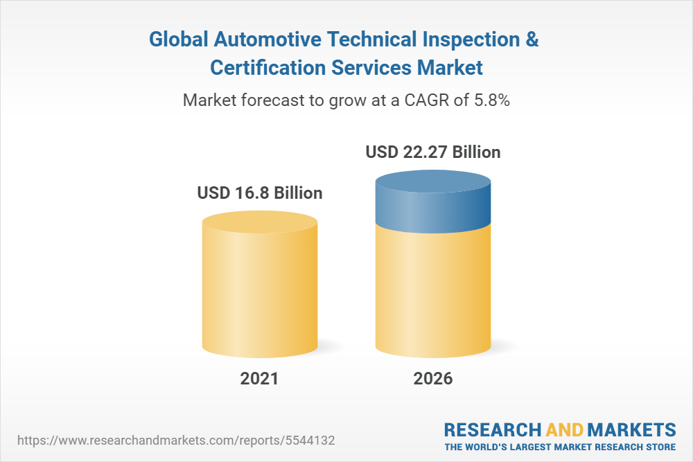 The Global Automotive Technical Inspection & Certification Services Market is estimated to be USD 16.8 Bn in 2021 and is expected to reach USD 22.3 Bn by 2026, growing at a CAGR of 5.8%.